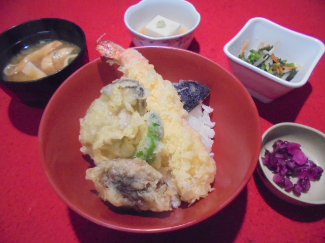 定番の海老天に、ぷりぷりの牡蠣や椎茸などの入った季節の天婦羅を熱々のご飯の上に盛り付けた天丼を提供いたします。