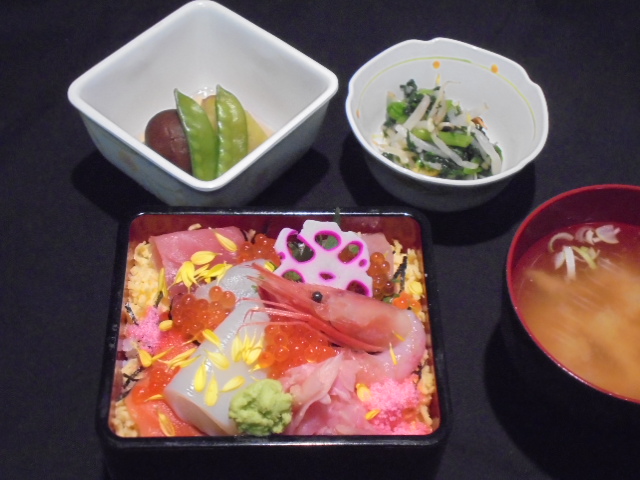 鮪、サーモン、帆立、海老のどの具材がたっぷり入った太巻き寿司に、ウニ、いくらの軍艦、地魚の鯵、鰤の握り寿司を盛り合わせた豪華なメニューです。