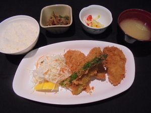 本日は、ハーブチキン、帆立のフライ、ナポリタンを一皿に盛り合わせ、色々な味が楽しめる一品です。