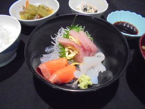 本日は特別食で、鮪・サーモン・帆立・イカ・ボタン海老・いくらなど、彩りよく盛りつけた北海散らし寿司です。